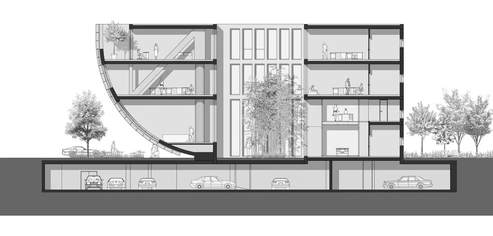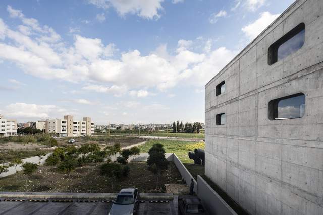 Брутальна конструкція практично позбавлена вікон, але стіна із заокругленого боку майже повністю прозора. Також будівля має внутрішній дворик. Тут прозорі стіни і саме через них потрапляє сонячне світло і робить приміщення світлішим.