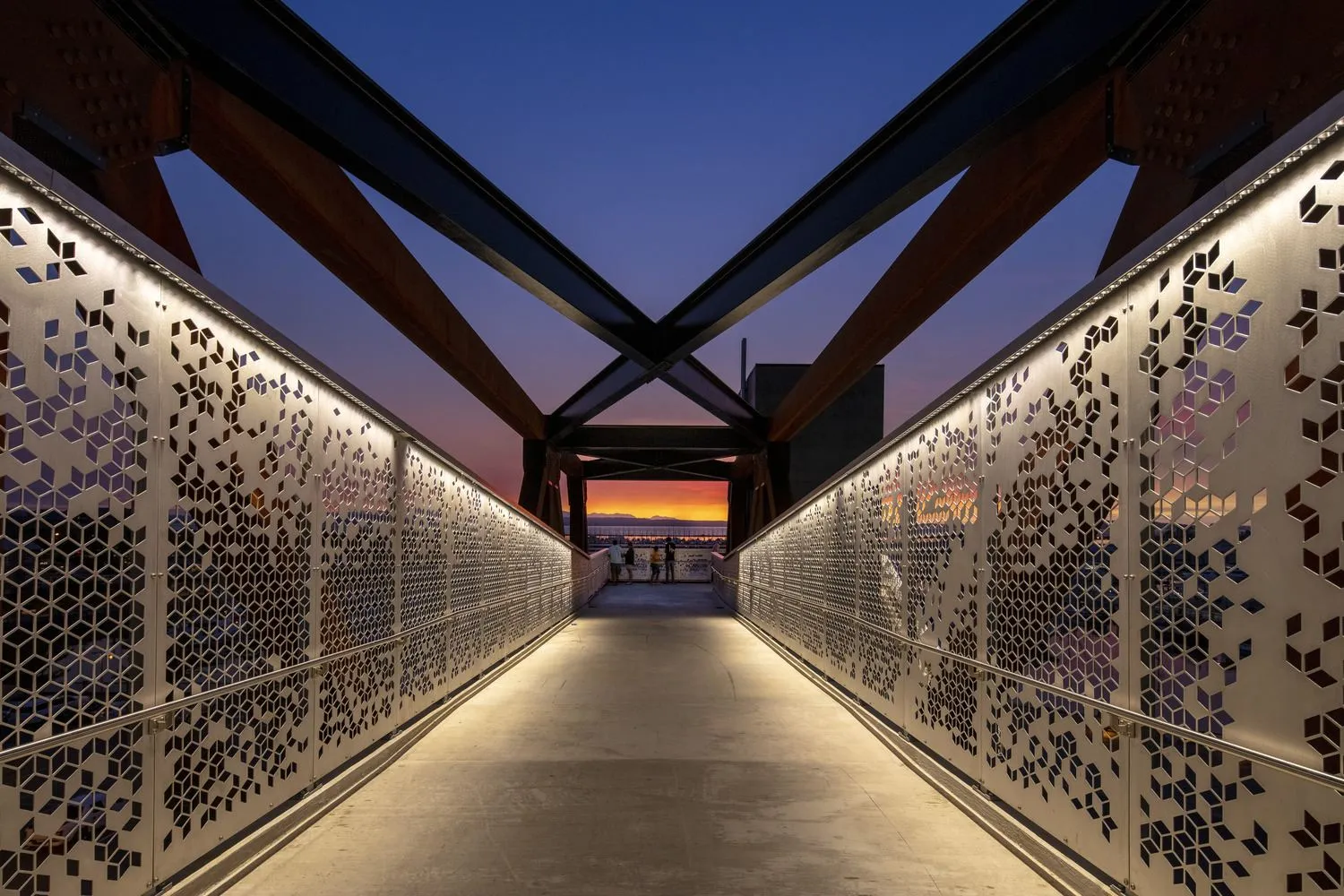 Дизайн прагматичний та економічний. Об'єкт зводили зі сталі та бетону, а оздоблення вирішили зробити лише на алюмінієвих огородженнях, які мають хаотичну перфорацію.