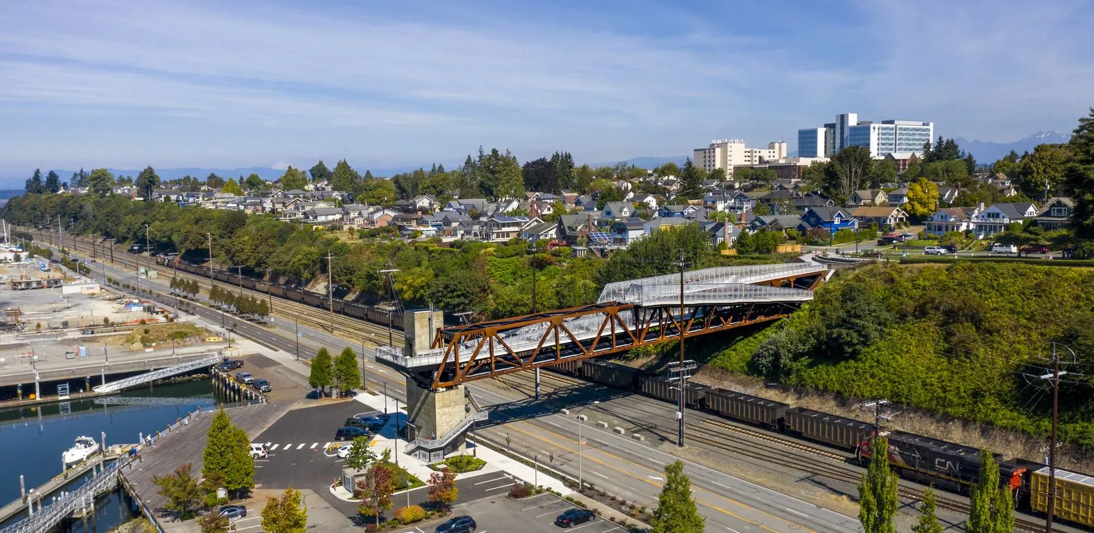 Міст покликаний полегшити перехід між набережною та районом міста, який розташований на 28 метрів вище. В результаті тут постала складна конструкція з переплетеними пішохідними пандусами та сходами.