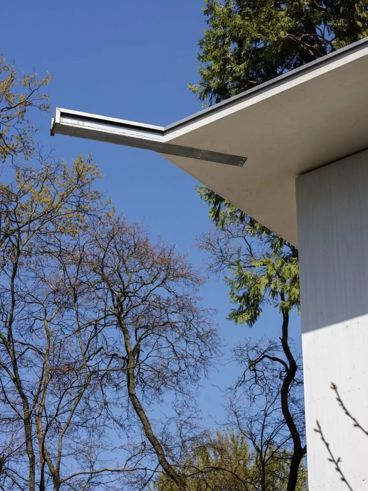 Нижня частина конструкції має один поверх та рівний дах. Частина, яка розташована нагорі, має вигляд звичайного будинку з двосхилим дахом, який виступає за межі будівлі. Архітектори зіграли на контрасті, адже внизу стіни прозорі, а нагорі закриті і мають лише одне вікно.