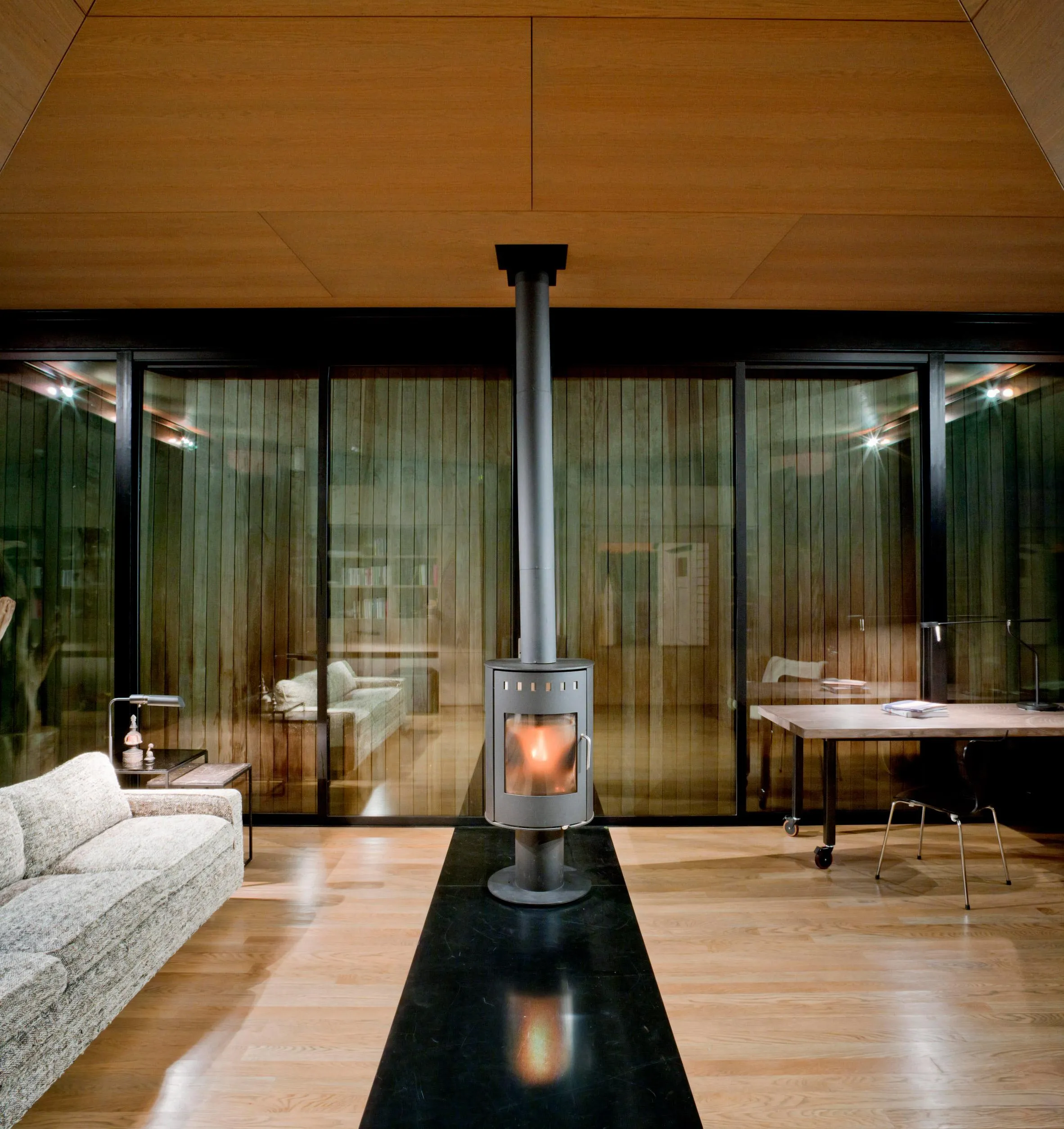 Загалом будинок складається з однієї кімнати та має 46 квадратних метрів. Дерев'яна підлога тут ділить простір навпіл з панеллю із почорнілої сталі, яка лежить під невеличким чорним каміном.