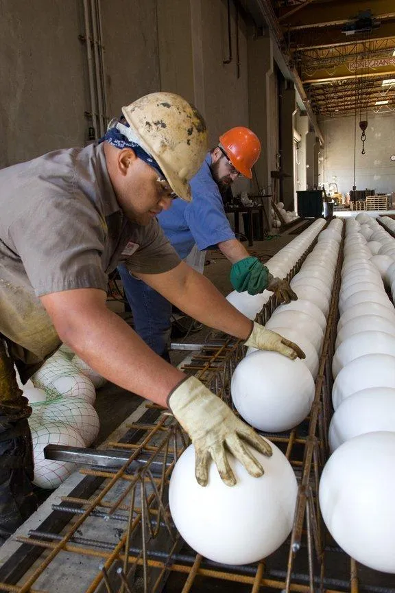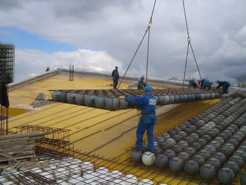 Суть заключается в использовании пластиковых шариков, наполненных воздухом. Так, небольшие сферы размещают в ряд между железными плитами, а полости заполняют бетоном.