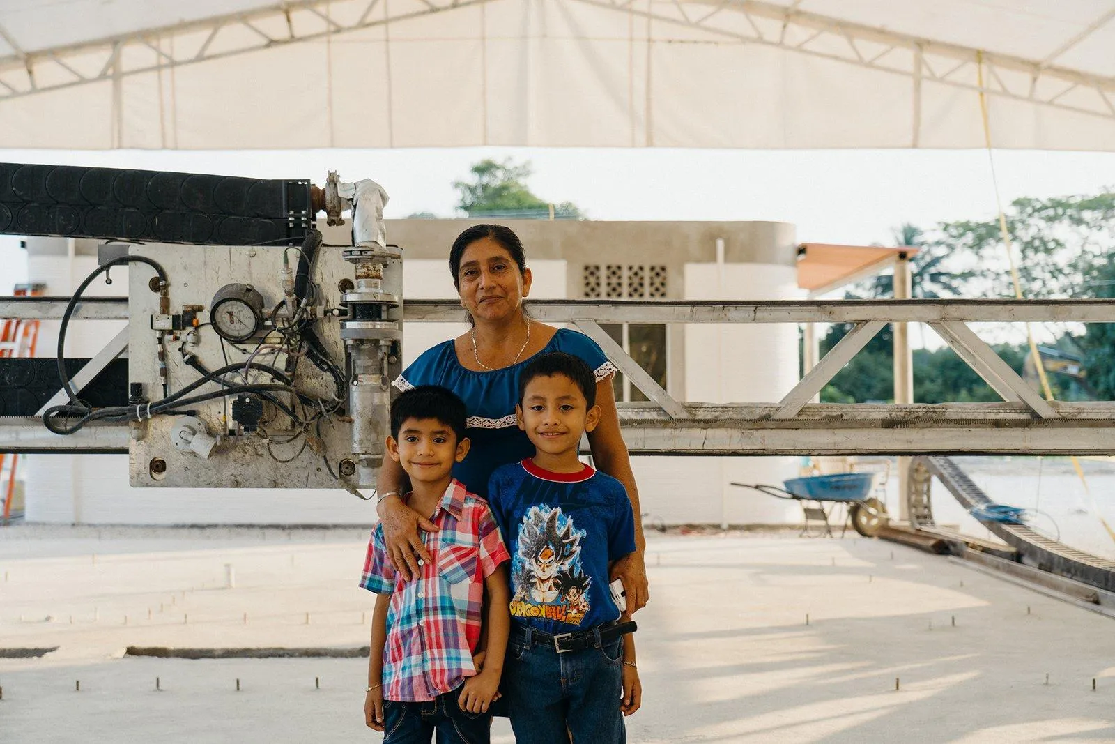 Первые жители поселения на фоне 3D-принтера Vulcan II / Джошуа Перес, New Story