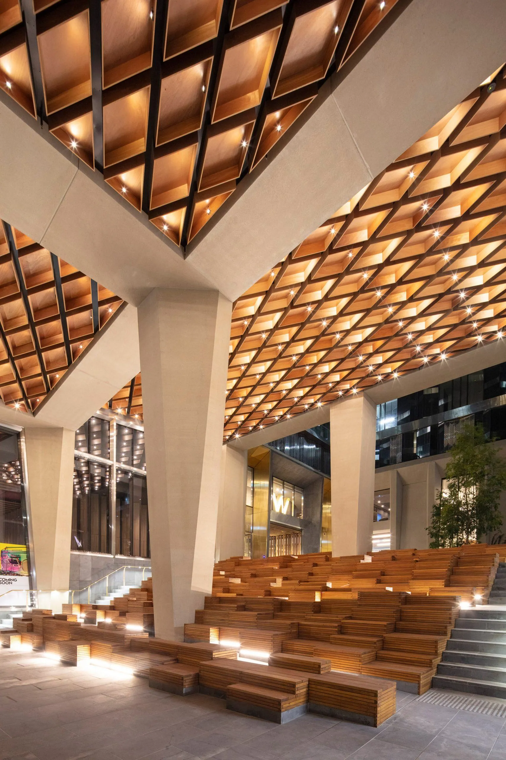Вместе с рядом магазинов, баров и ресторанов, здание предлагает центральный дворик – крытый амфитеатр и парк площадью почти в 1900 квадратных метров.