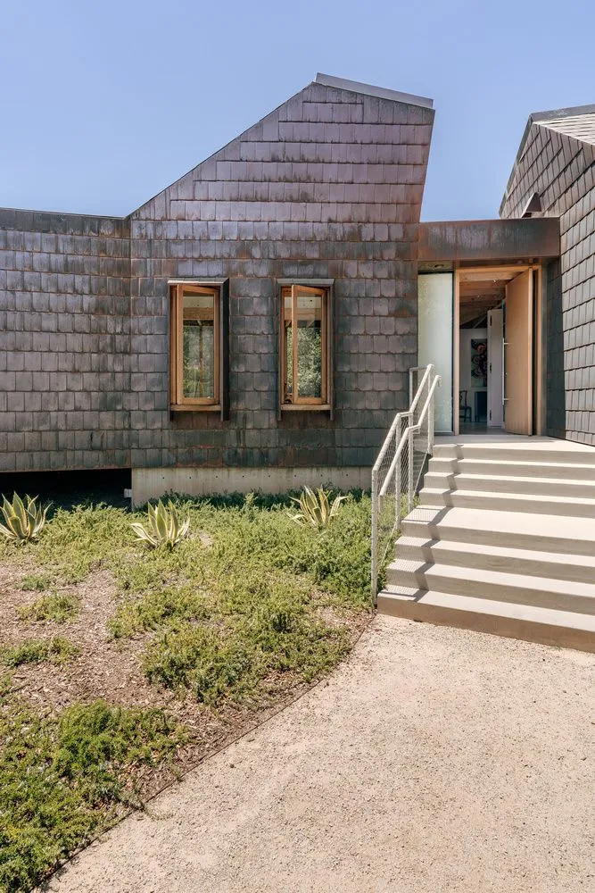 Район Южной Калифорнии, в котором расположена вилла, известный своими пожарами. Как результат, местные строительные нормы запрещают использовать древесину, не защищеную от огня. Для решения этой задачи дом построен с деревянной внутренней конструкцией и огнеупорной внешней броней из медной плитки.